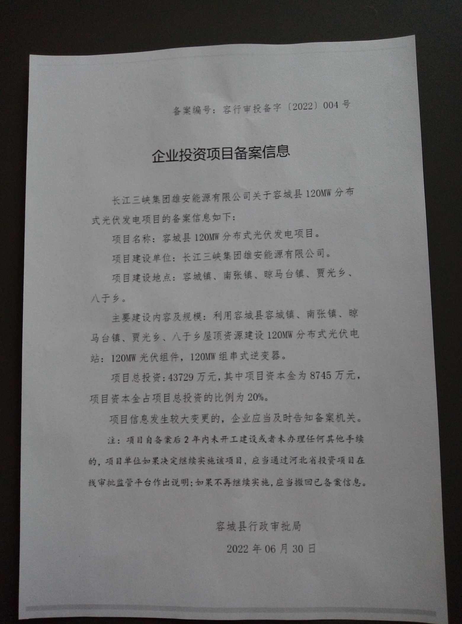 | 项目名称 | 容城县120MW分布式光伏发电项目 | ||||