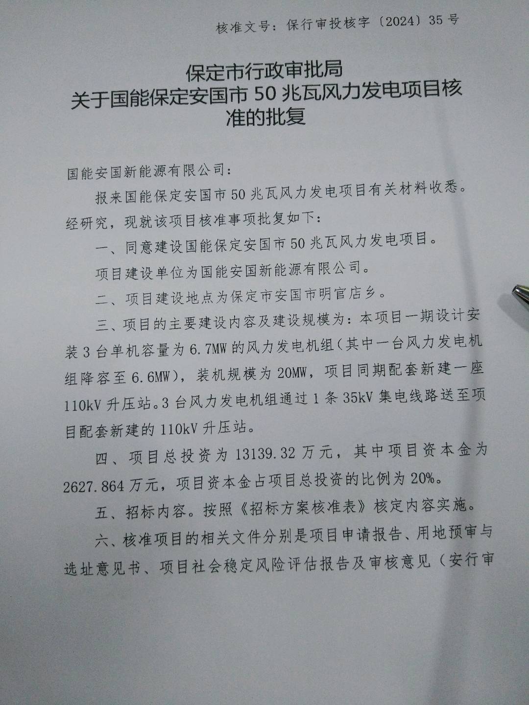 | 项目名称 | 国能安国新能源有限公司国能保定安国市50兆瓦风力发电项目 | ||||