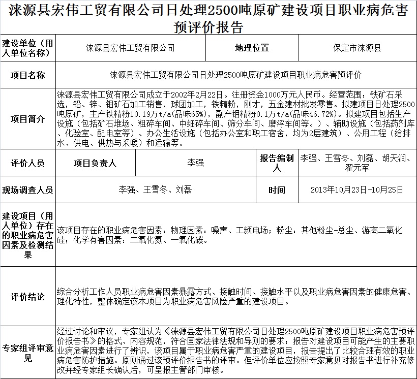 涞源宏伟工贸有限公司日处理2500吨原矿建设项目职业病危害预评价